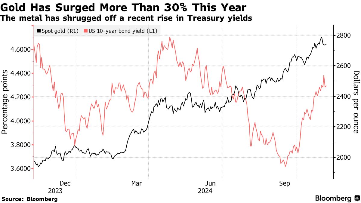今年黄金价格已上涨超过30%,创下历史新高,这一涨势受到地缘政治和经济风险加剧的推动,促使中央银行和消费者的购买。随着美联储转向降息以及美国大选临近,过去几个月的涨势愈发明显,帮助黄金摆脱了传统的阻力,如国债收益率上升。