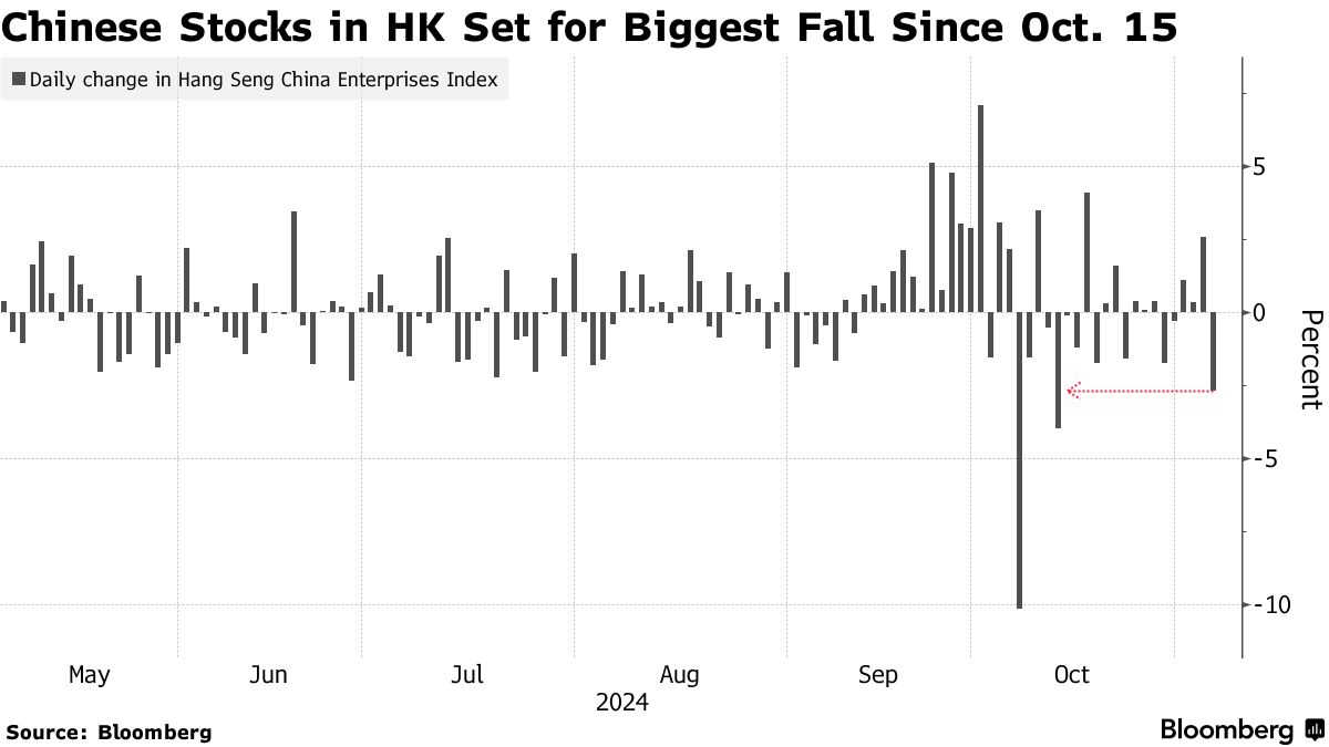 恒生中国企业指数下跌约3%,在亚洲市场中领跌。香港股市的下跌——与外部事件和全球资金流动更紧密相关——反映了国际投资者对特朗普可能连任的担忧,这可能会带来加剧的贸易紧张局势和政策意外。与此相比,中国大陆上市的股票表现 相对较好,因为市场预期政策制定者将推出更多刺激措施。