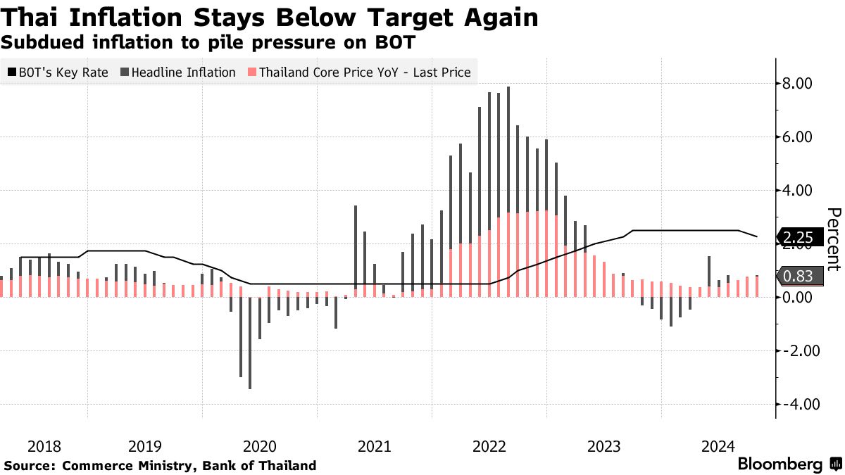 泰国的通货膨胀连续第五个月低于中央银行的目标,这给货币当局施加了继续降息以促进价格上涨和经济增长的压力。