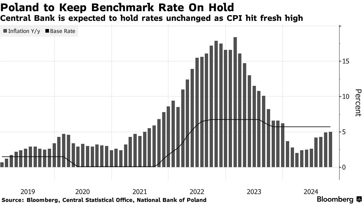 根据彭博社对36位经济学家的调查,设定利率的货币政策委员会将在周三将基准利率维持在5.75%。中央银行还将发布关于通货膨胀和经济增长的新预测,行长亚当·格拉平斯基预计将在周四举行新闻发布会。