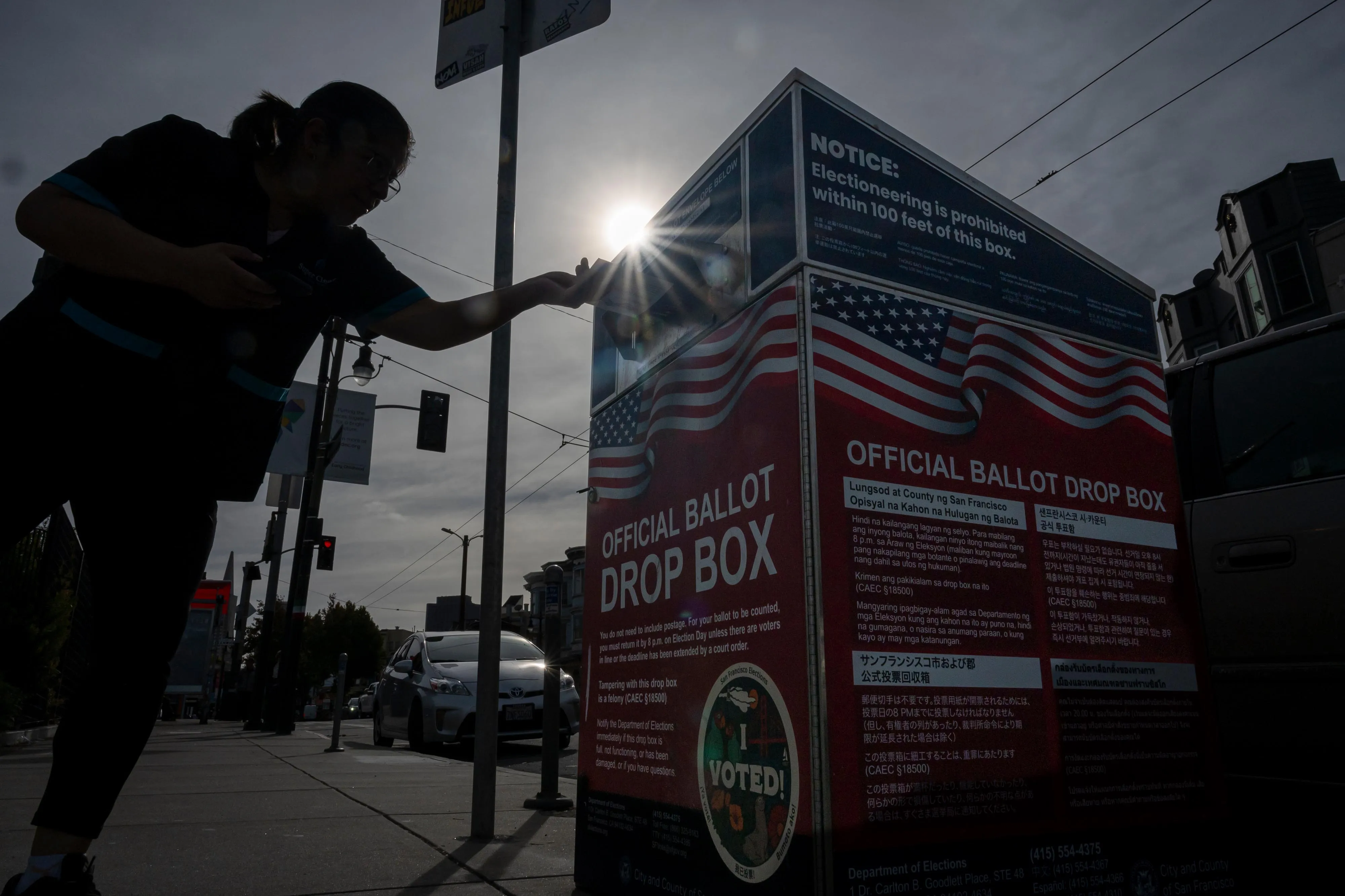 选民在加利福尼亚州旧金山的官方投票箱中提交他们的选票,时间是11月5日。