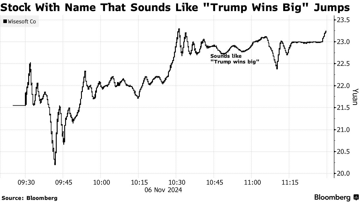 软件和设备制造商 Wisesoft Co. 的股票,其本地语言名称“川达智胜”暗示特朗普胜利,在深圳涨停。该股票在2016年共和党赢得选举后也曾上涨。