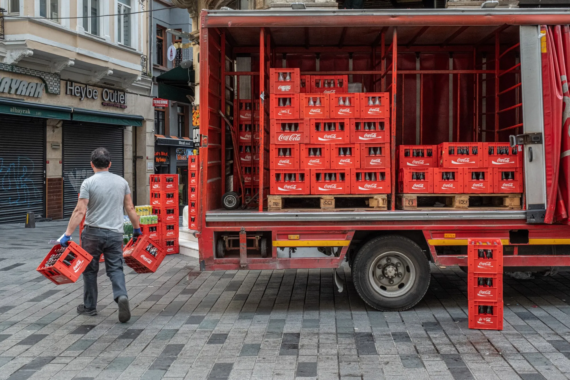 一名送货司机在伊斯坦布尔的清晨卸下可口可乐饮料的箱子。