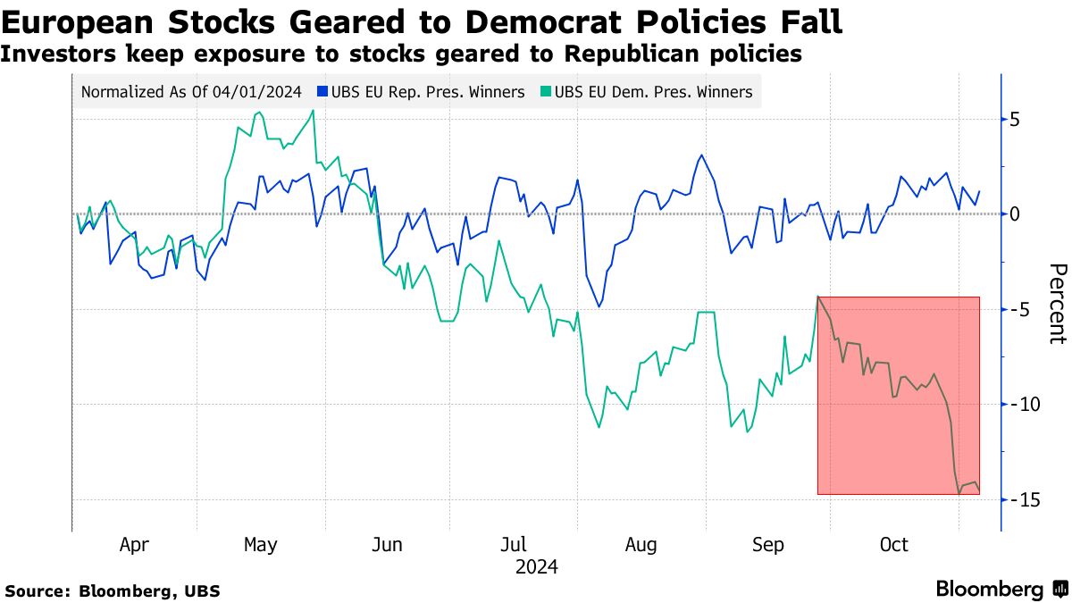 投资者在过去几周已经开始撤出与民主党政策相关的股票。瑞银集团AG的一篮子被认为受益于IRA的欧洲公司,以及在贸易关系顺畅时表现最佳的可再生能源股票和公司,上个月下跌了约10%。