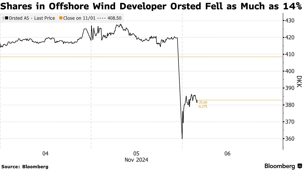 两家领先的丹麦公司的股票领跌,开发商奥斯特德公司下跌了多达14%,而涡轮机制造商维斯塔斯风能系统公司在哥本哈根下滑了13%,随后收窄了损失。其他公司,包括德国的RWE AG和Nordex SE,也出现下滑。