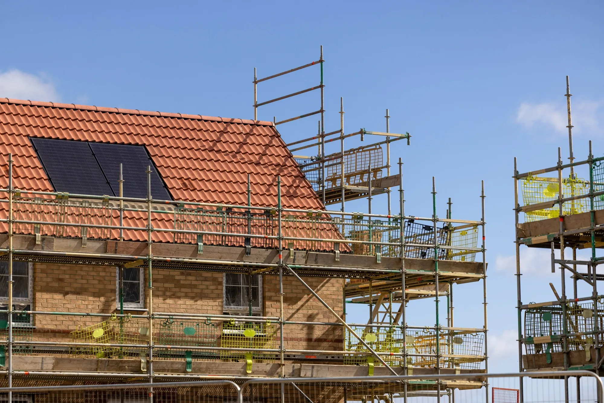 在博罗桥的住宅区,正在建设中的房屋周围的脚手架。