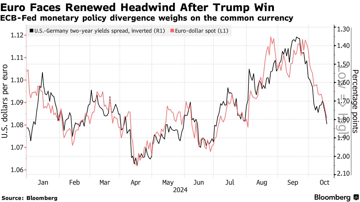 货币交易者正在转向反对欧元,因为唐纳德·特朗普在美国总统竞选中的胜利提高了激进的欧洲利率削减的可能性,这将使共同货币朝着与美元平价的方向发展。