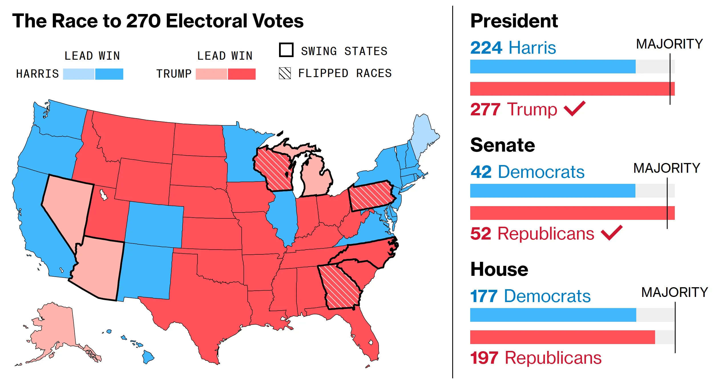 唐纳德·特朗普 将 重返白宫,在 确保关键战场州 包括宾夕法尼亚州、北卡罗来纳州和乔治亚州。共和党人还 赢得了参议院,结果显示特朗普在多个地区的表现超过了2020年的得票。凌晨时分,GOP提名人向支持者致辞,称这是“我们国家前所未见的政治胜利。”请关注我们的 实时报道。