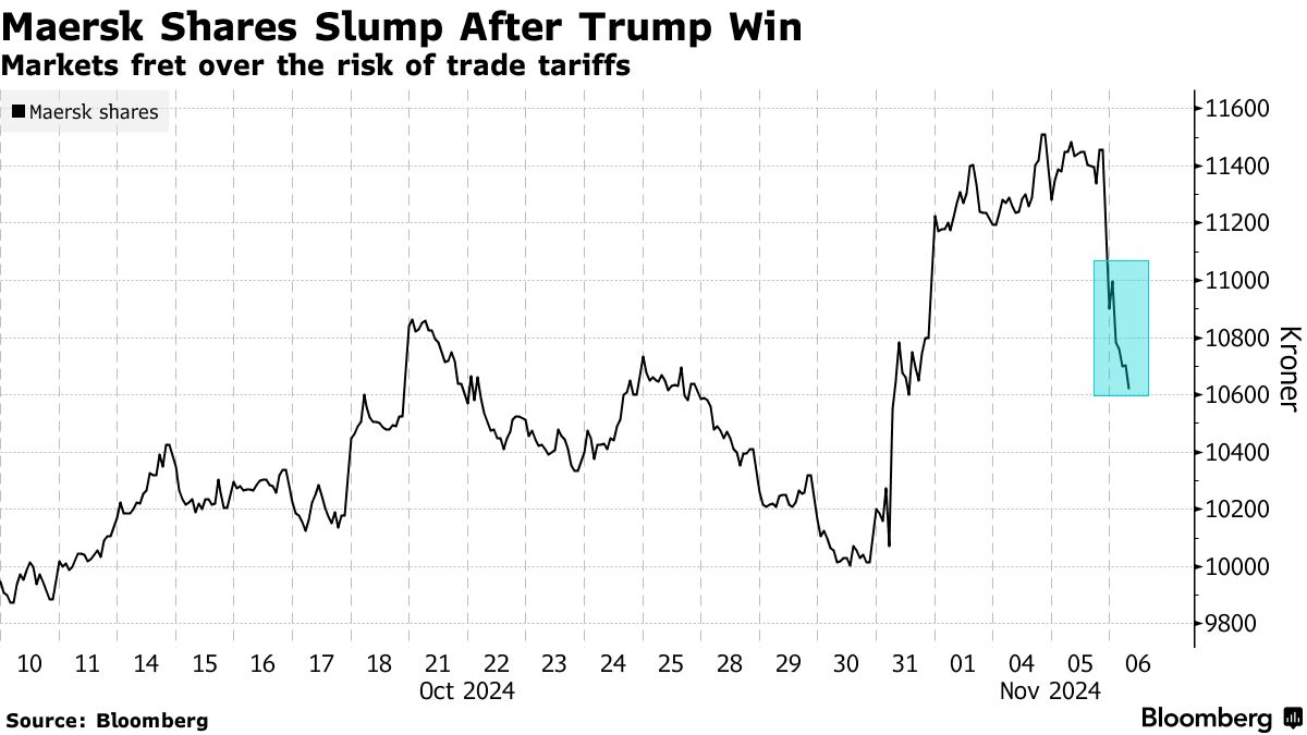 分析师Jorgen Lian在DNB Markets表示:“集装箱股票因全球贸易壁垒对成品流动的明显影响而下跌。像马士基这样的股票在头条主题上受到了一些压力,尤其是在选举前一周经历了显著的上涨之后。”