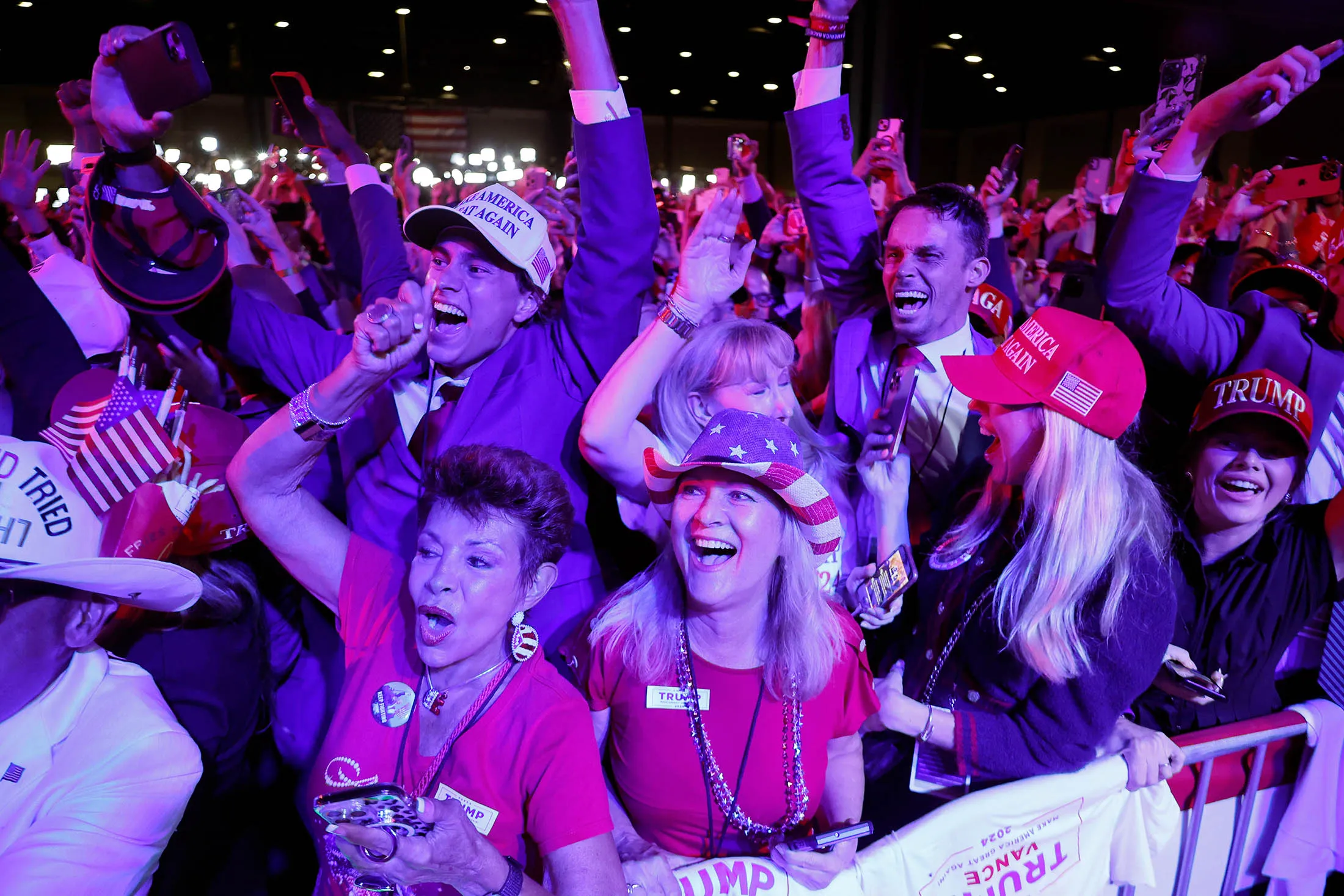 支持者在棕榈滩会议中心庆祝福克斯新闻预测特朗普获胜。摄影师:Chip Somodevilla/Getty Images特朗普的胜利是由美国内部的深刻分歧和不满推动的。根据一项CNN出口民调,73%的选民对国家的方向感到愤怒或不满。