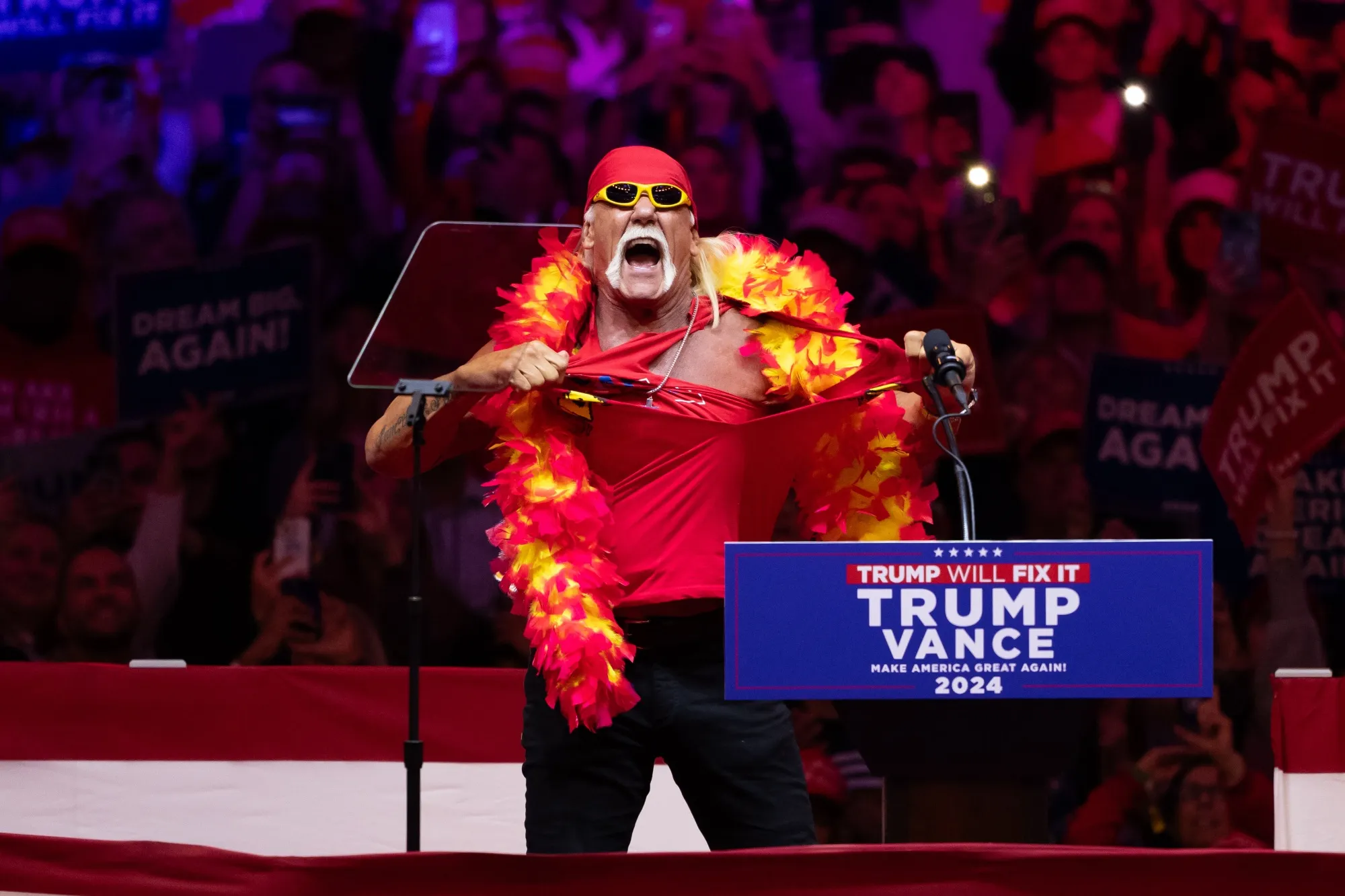 霍克·霍根在麦迪逊广场花园为特朗普竞选。摄影师:亚当·格雷/彭博社没有最近的主要总统候选人比特朗普的“兄弟”竞选更倾向于激进的男性身份。特朗普在一次集会上发誓要“保护”女性,无论她们“喜欢与否”,并选择了前职业摔跤手霍克·霍根作为他共和党提名接受演讲的热身,霍根在特朗普上台前撕掉了他的衬衫。