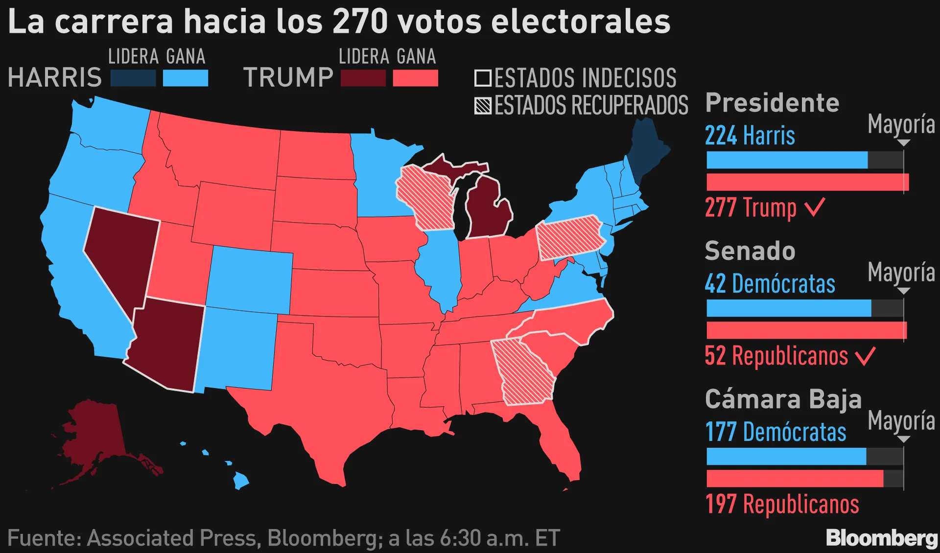 唐纳德·特朗普被选为 美国第47任总统,在美国历史上最两极分化的白宫竞选中实现了惊人的政治逆转。78岁的特朗普在一场前所未有的竞选中获胜,期间他因重罪被定罪,经历了两次暗杀未遂,并在竞选最后几个月中,面对副总统卡马拉·哈里斯的挑战,她接替了一位不受欢迎的总统乔·拜登。共和党人还在特朗普盟友的一系列胜利中赢得了参议院的控制权,为他们的党在明年的重要税收和支出斗争中提供了强大的杠杆。