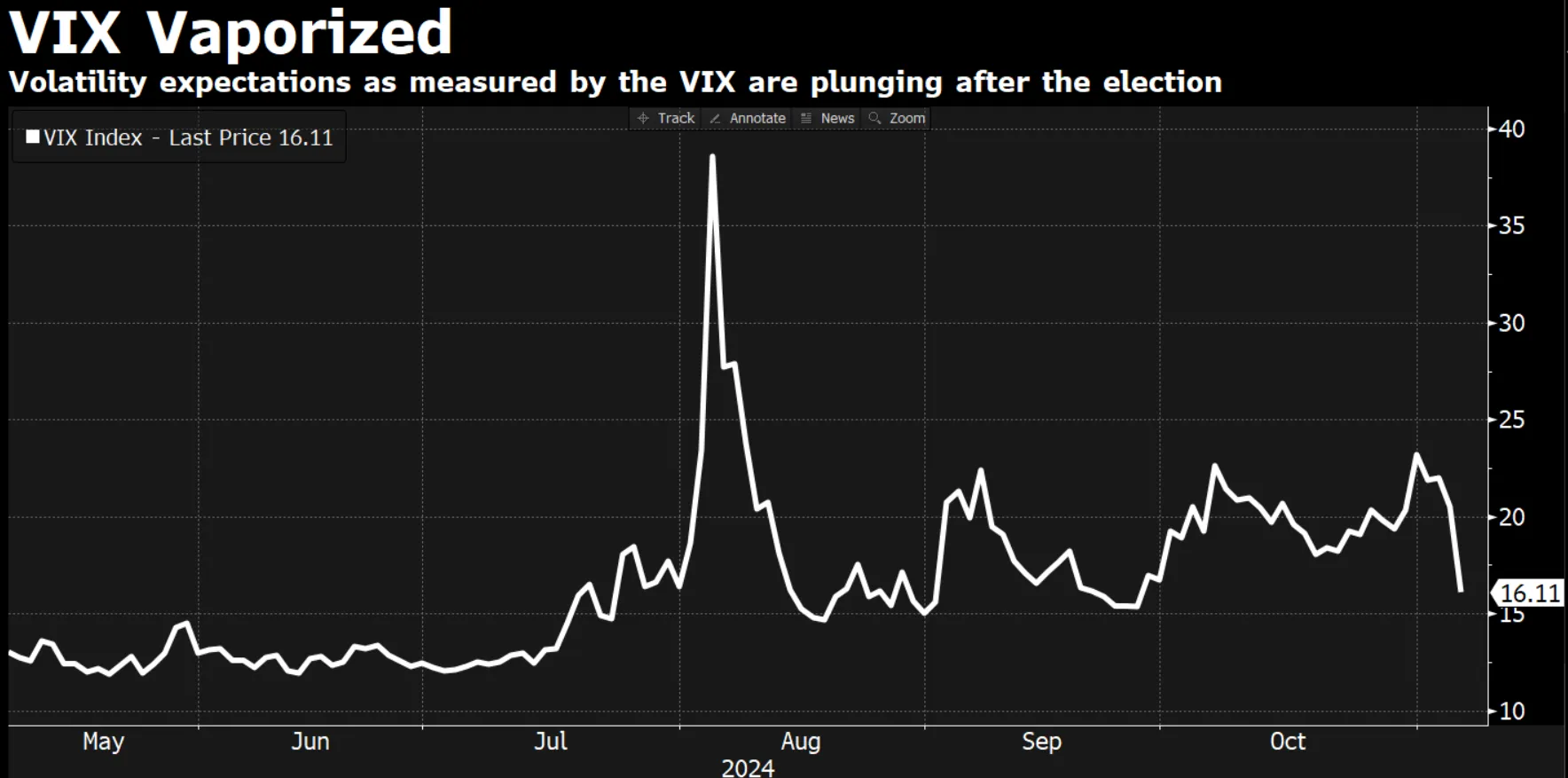 - 今天股市正在飙升。事实上,今年以来一直在飙升。今天的部分涨幅可能归因于投资者对特朗普政策(减税、轻监管等)的偏好,但这里可能还有一个因素,就是选举不确定性终于结束。赢家迅速宣布——没有几周的法律争斗——并且没有理由认为正常的权力交接会出现任何问题。因此,VIX今天大幅下跌,因为市场中的重大选举 不确定性因素消失了。