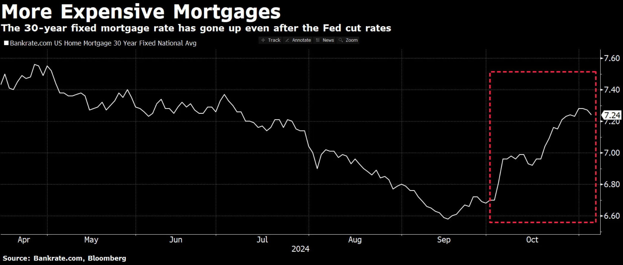 - 10年期收益率今天再次上涨,现在达到了自7月初以来的最高水平。一个重要的故事是高昂的住房和抵押贷款利率,显然(在所有条件相等的情况下)收益率的上升意味着抵押贷款利率的提高,这是人们所不喜欢的。而且,更高的利率对所有房地产开发商都是有害的,而特朗普正是来自这个领域。这对即将上任的政府来说也是一个政治挑战。