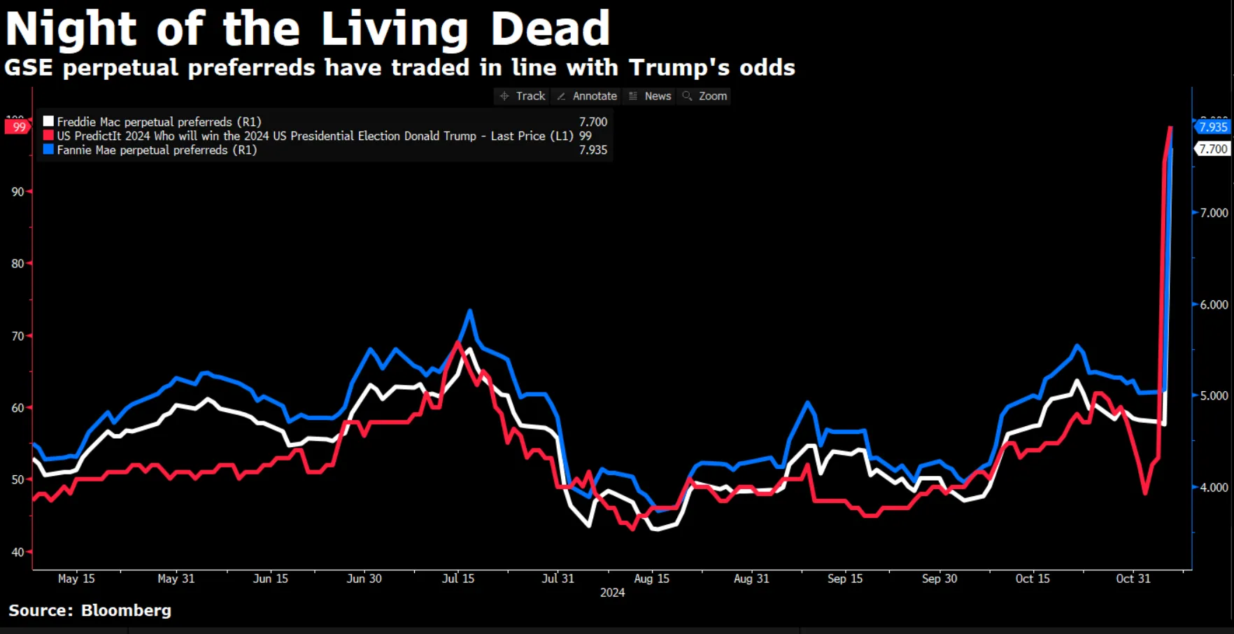 * 一系列事情与特朗普赢得胜利的机会一起发生了变化(比如比特币、DJT和美元指数),但有一件事在雷达下悄然变化,那就是由房利美和房地美发行的永久优先股的变动,也就是所谓的GSE“僵尸”股票。这里的赌注是,特朗普 可能会将房利美和房地美从监管中解放出来,这意味着他们理论上可以再次向优先投资者支付股息。