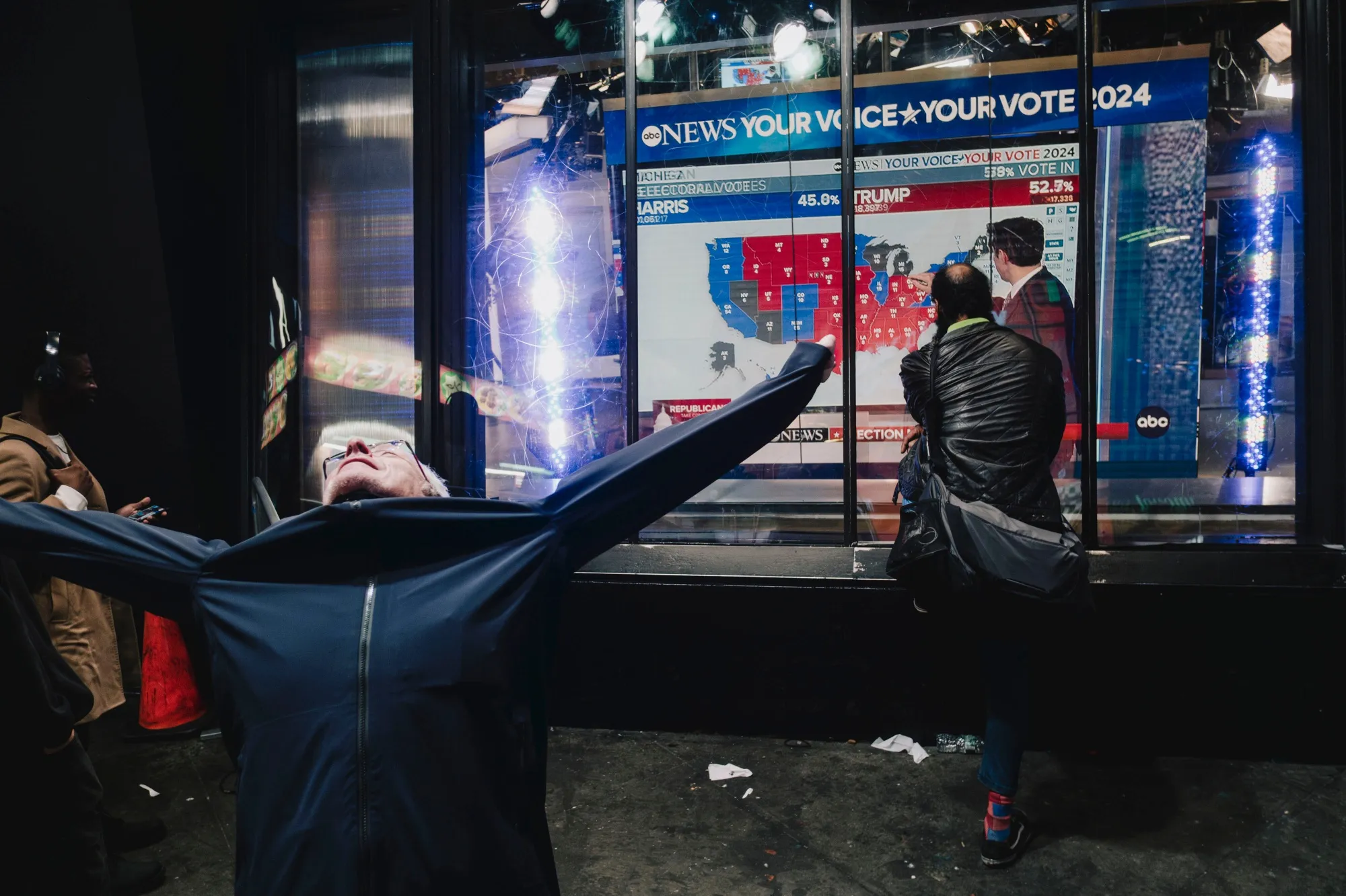 旁观者在美国纽约时代广场观看2024年美国总统选举结果的直播。
