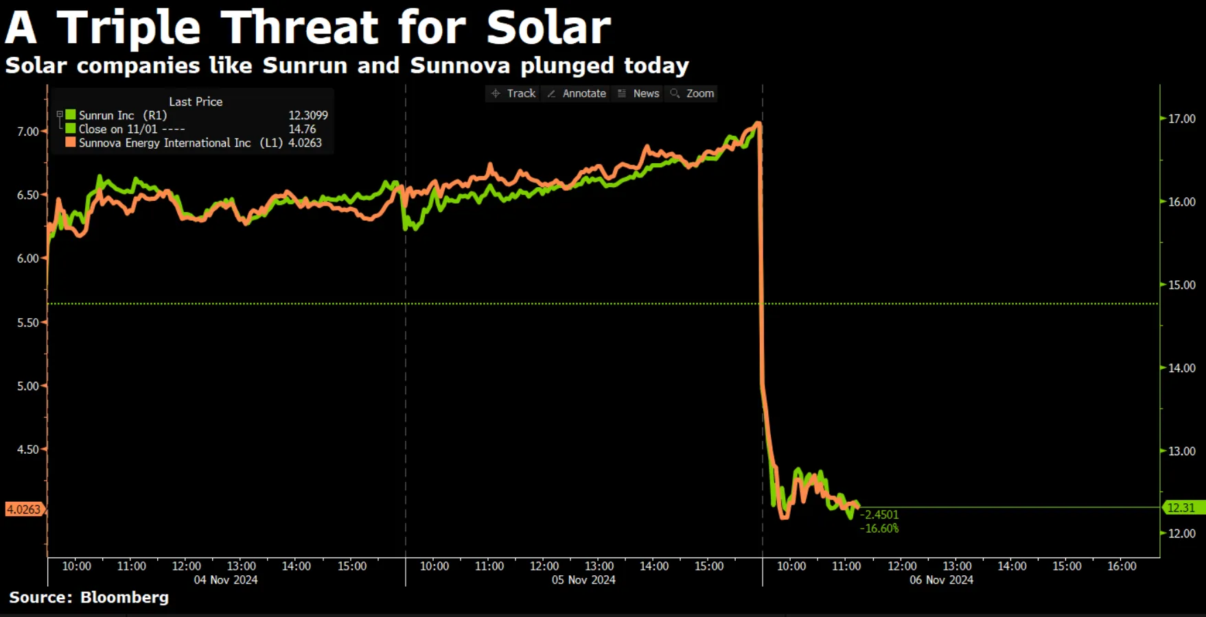 - 说到清洁能源和需要大量前期投资的东西,显然这里存在双重威胁。不仅在税收抵免等政策方面可能会发生变化,还有潜在的更高利率的影响。进一步说,你可以认为一些公司(尤其是在太阳能领域)面临着三重威胁,因为他们还面临着“未来收入的折现率上升”,正如CreditSights的债券分析师所说。像Sunrun和Sunnova这样的公司今天分别下跌了27%和28%。