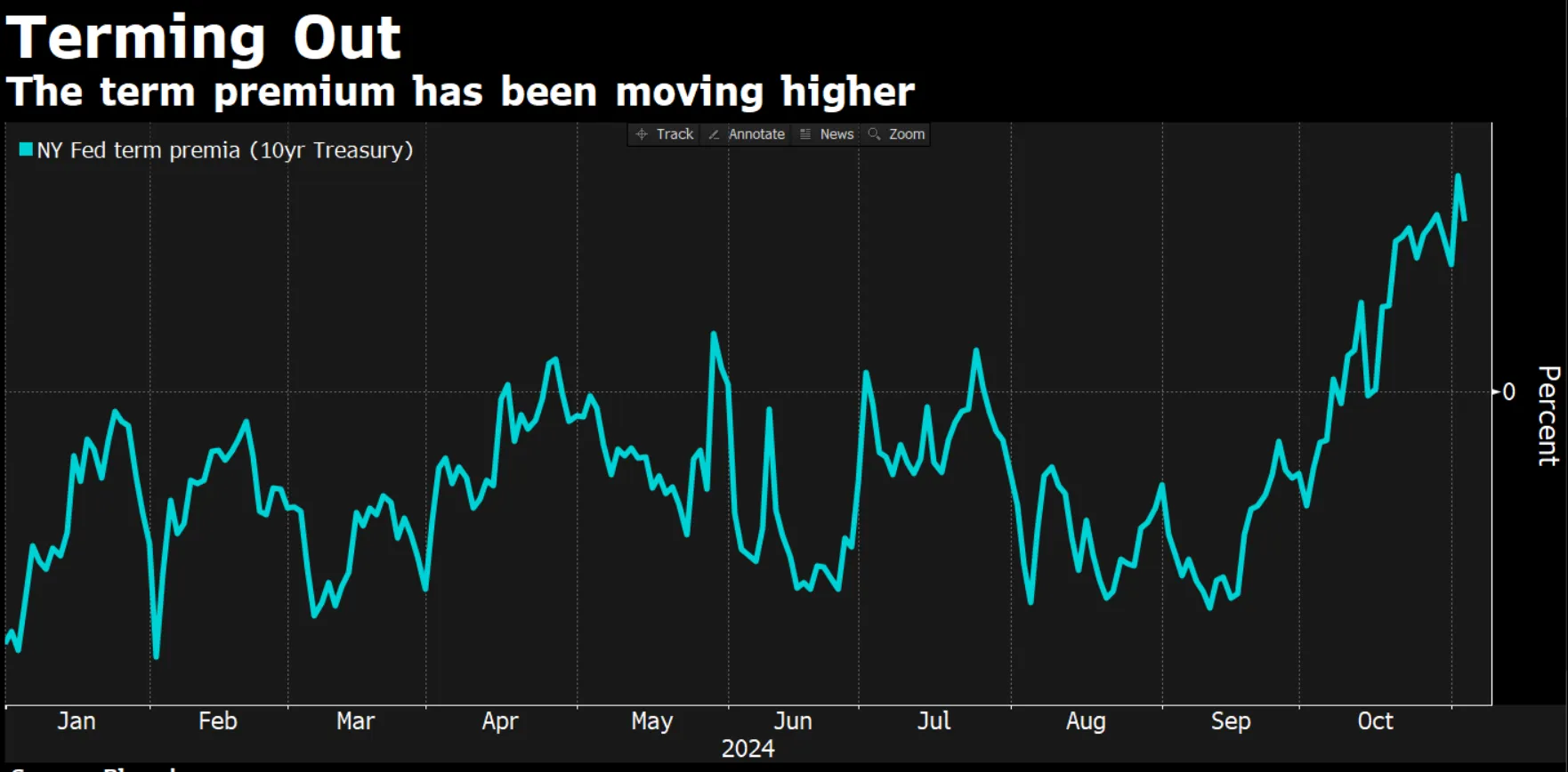 * 具体来说,特朗普可以像他在上任期间那样对杰罗姆·鲍威尔施加压力。而且他很有可能在某个时候替换掉他。但即便如此,这并不自动解决任何问题。如果你认真对待主流经济思想,而美联储采取激进的降息措施以与政府保持一致,那么这在理论上是通货膨胀的,然后你只是将挑战转移到其他地方。债券市场上悬而未决的许多不确定性正在被定价到期限溢价中,期限溢价大致定义为投资者要求持有长期债券的额外补偿。