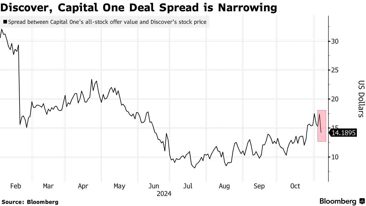 Capital One和Discover的股票在周三早上分别上涨了19%和24%,均创下四年来的最大涨幅,达到历史新高。这缩小了Capital One股票报价与Discover当前交易水平之间的差距,从本周早些时候的18美元缩小至大约14美元——这表明市场对交易成功的可能性越来越乐观。