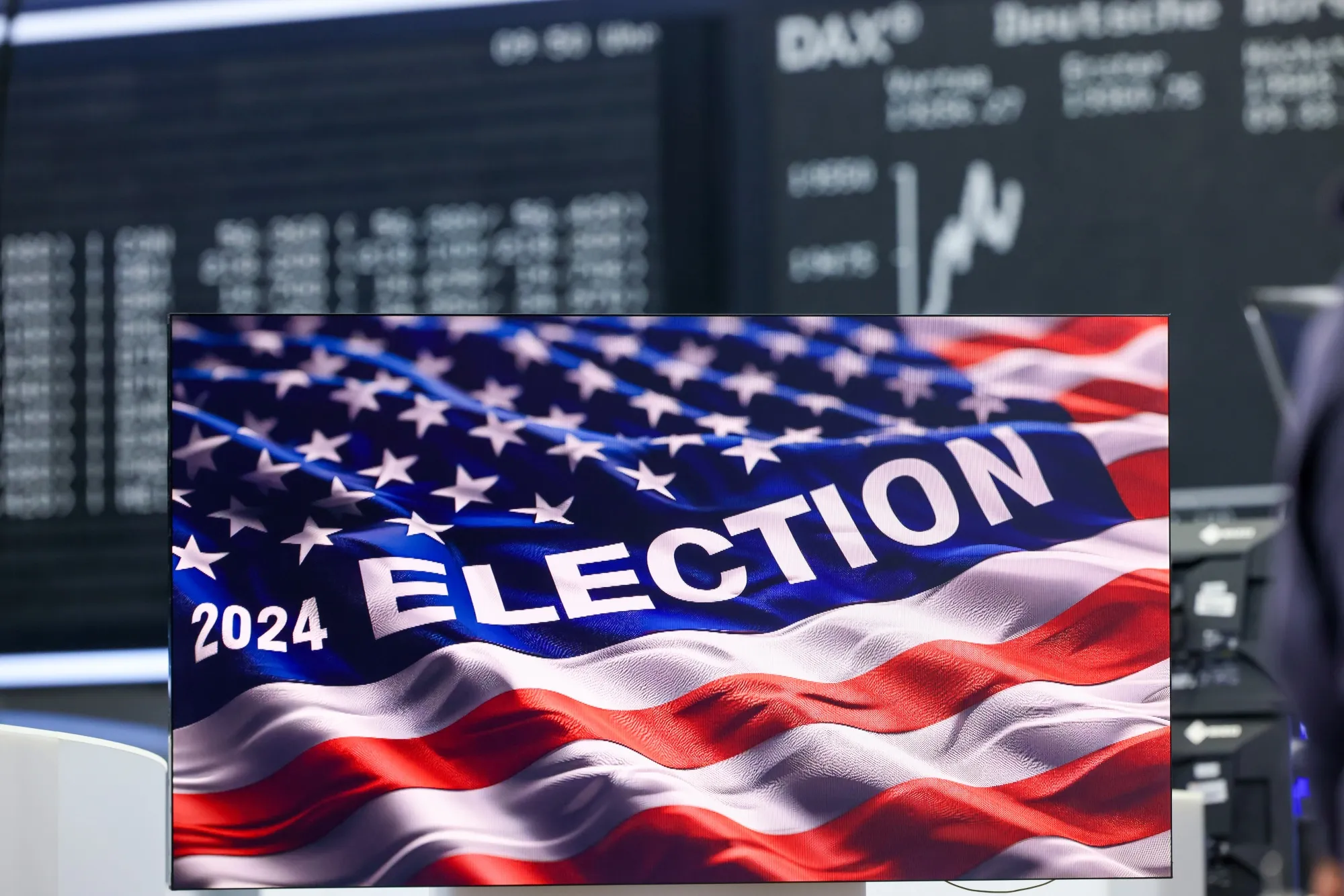 DAX指数的收益率曲线在法兰克福证券交易所的电视屏幕上显示,屏幕上有美国星条旗的图像和“2024年选举”的口号。