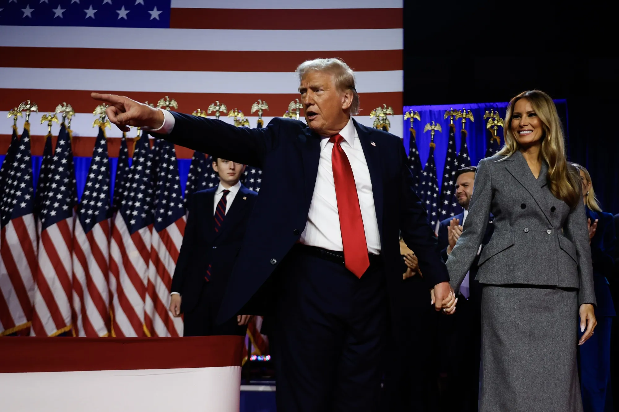 唐纳德·特朗普在佛罗里达州西棕榈滩的棕榈滩会议中心举行的选举之夜活动中与梅拉尼娅·特朗普一起向支持者致意,时间是11月6日。