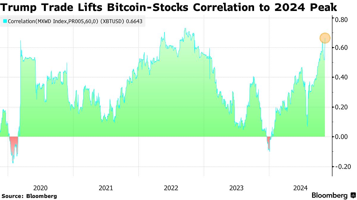 比特币和股票因特朗普对加密货币的支持和亲商业倾向而双双上涨。根据彭博社汇编的数据,这使得该代币与MSCI Inc.全球股票指数的60天相关系数升至0.66,这是过去五年中相对罕见的水平。1的读数表示资产同步移动,而-1则表示反向关联。