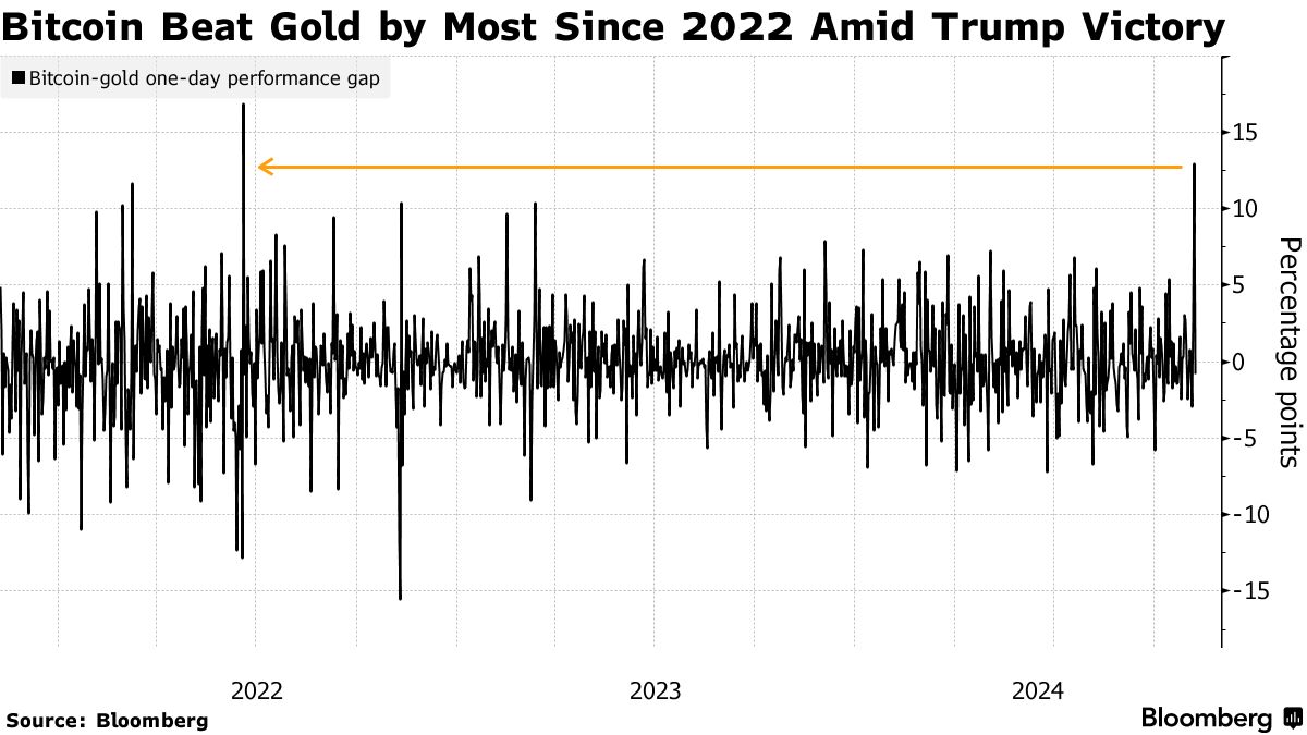 他通往白宫的步伐使比特币达到了创纪录的高点,打开了自2022年以来与黄金之间最广泛的表现差距,并在全球最大的代币基金中引发了前所未有的交易量。