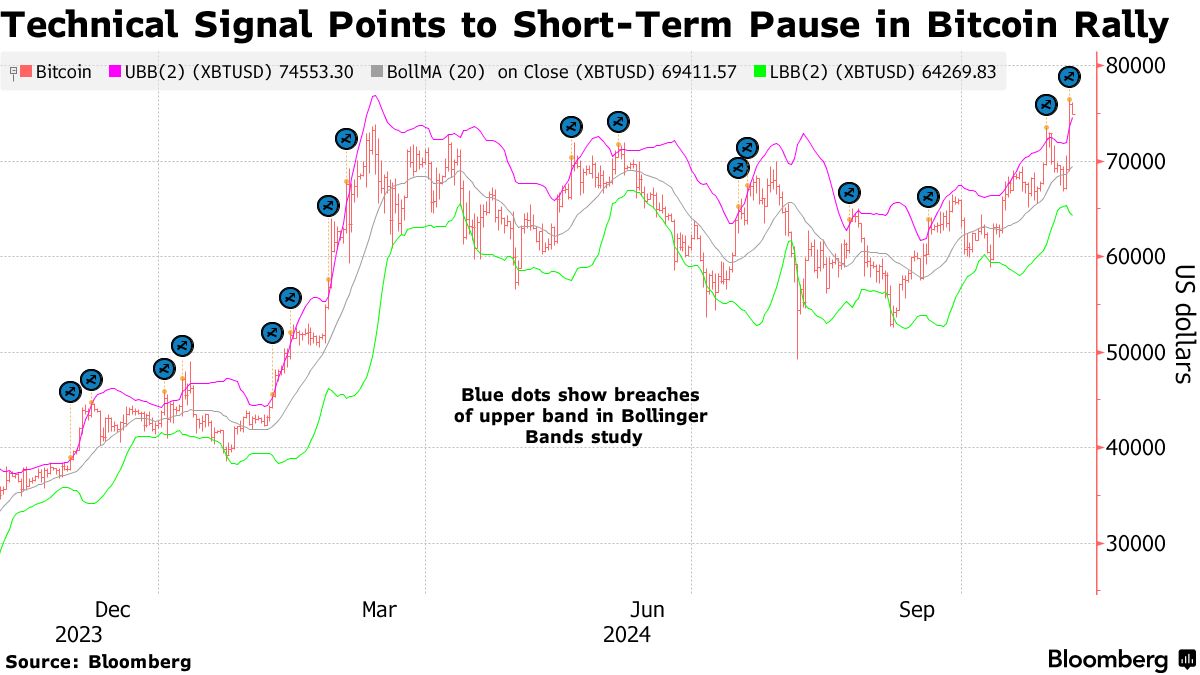 对比特币进行的布林带技术研究发出了谨慎的信号,因为该代币突破了其上轨——这可能是动能拉伸的迹象。根据彭博社汇编的数据,在过去一年中,比特币在突破上轨后的20天内平均上涨不到0.5%。