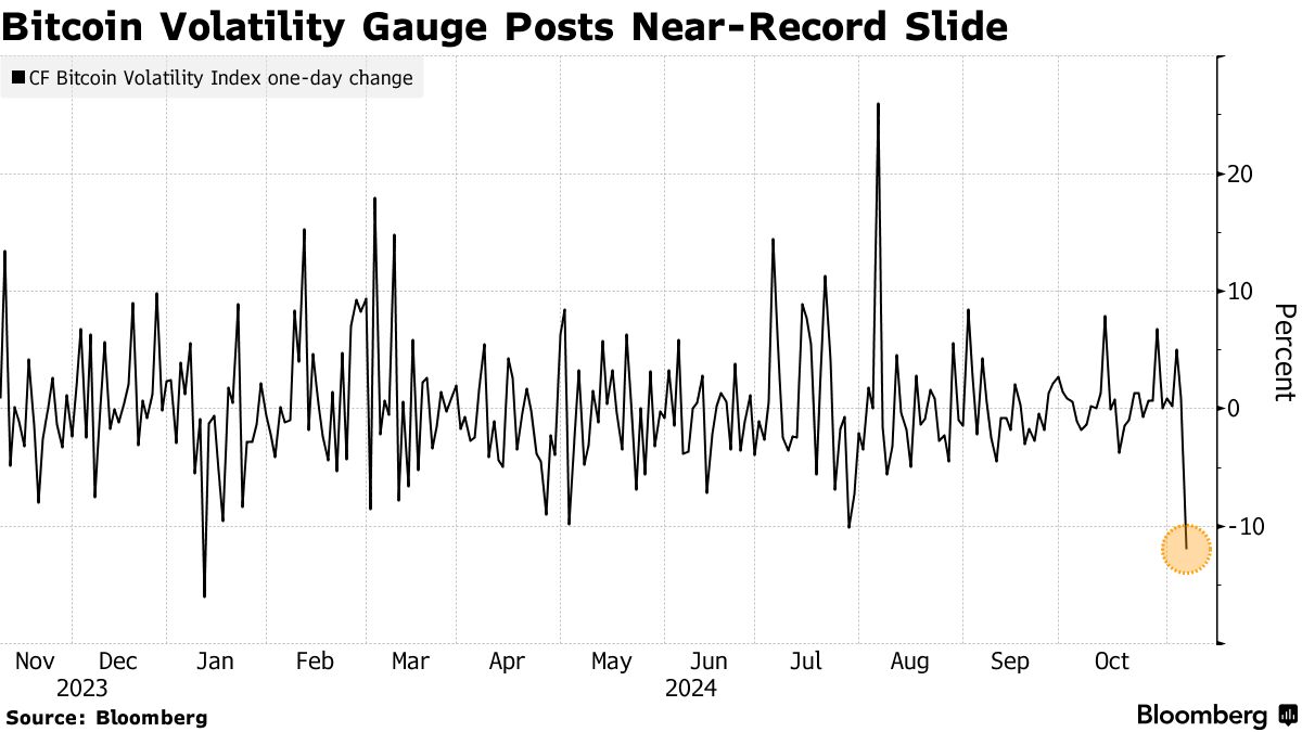 在比特币创纪录的反弹后,对其波动性的预期正在降温。根据彭博社汇编的数据,代币的30天隐含波动率指标刚刚经历了第二大跌幅。由CF Benchmarks Ltd.汇编的指数源自CME Group比特币期权定价。“随着市场对选举的进一步明确,波动性也显著下降,”FalconX研究主管大卫·劳安特在一份报告中写道。