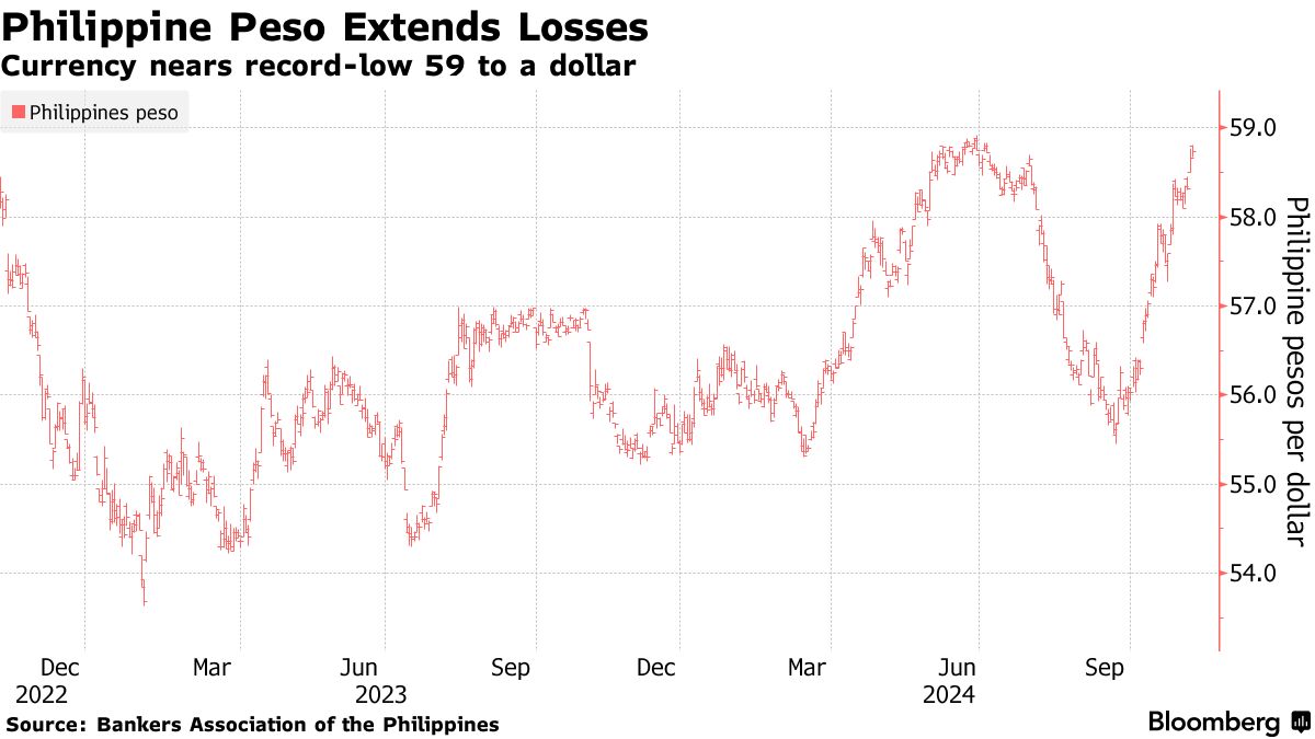 菲律宾比索在周四连续第二天下跌,汇率为58.73比1美元,为自7月以来的最低水平,接近2022年创下的59的历史低点。这种疲软与美国选举结果后一些亚洲货币的下跌相一致。