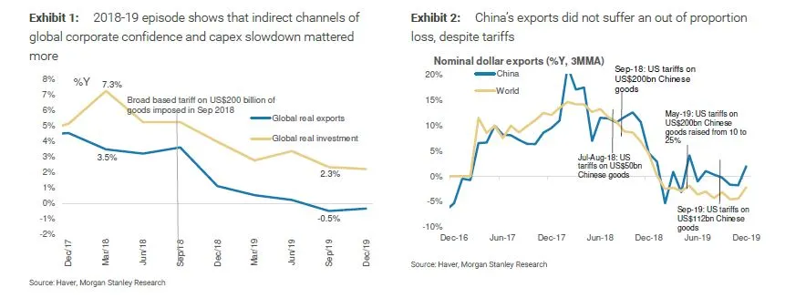 摩根士丹利的经济学家切坦·阿亚在一份报告中指出,如果当选总统特朗普在上任后迅速对中国实施高额关税,那么对全球资本支出和企业信心的间接影响可能比关税本身的直接影响更值得关注,这份报告借鉴了2018-19年贸易战的经验。