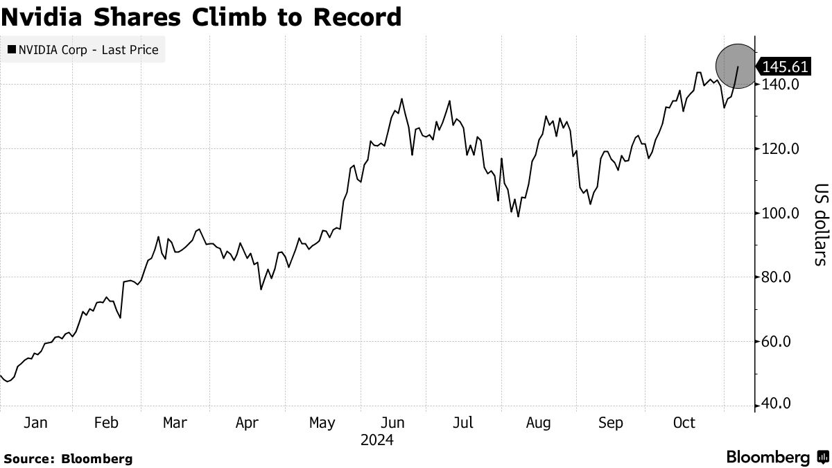科技巨头的支出计划正是牛市所期待的,以保持Nvidia股票的上涨。该股票今年几乎上涨了三倍,并在周三因 广泛 的股市上涨而上涨4.1%,创下新高,受益于唐纳德·特朗普的选举胜利。位于加利福尼亚州圣克拉拉的AI芯片制造商 超越 苹果公司,本周再次成为全球最有价值的公司。
