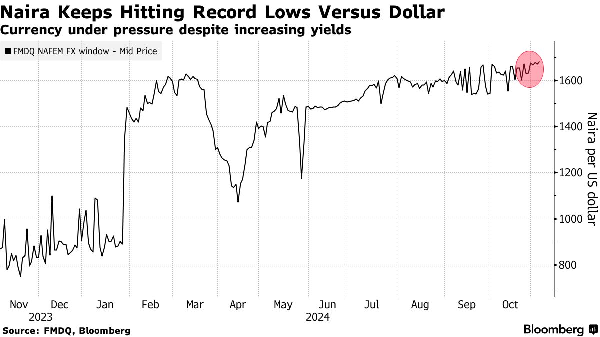 摄影师:本森·伊比阿布奇/彭博社创纪录的高固定收益率和中央银行的干预未能阻止奈拉的下滑,尼日利亚货币本周创下新低。