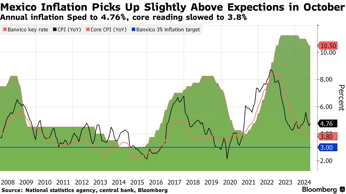墨西哥的headline通胀在10月接近预期加速,而一个备受关注的核心指标放缓,这可能使中央银行在下周继续降息。