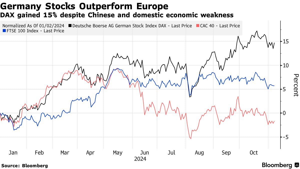 德国股票今年迄今表现良好,涨幅达到15%,超过所有主要欧洲同行。人们押注该国将间接受益于中国的刺激措施,加上基准指数中唯一的科技巨头SAP AG,帮助DAX保持在接近历史高位,尽管经济数据令人沮丧。