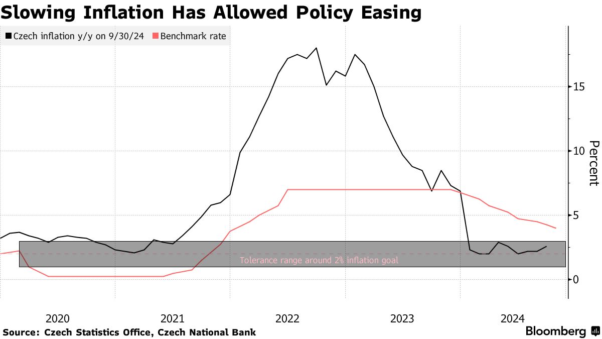 货币市场价格显示,在捷克9月份的通货膨胀数据高于预期以及美国国债收益率上升后,投资者已减少了对未来几个月放松政策的押注。在周四的决定之前,远期利率协议显示到今年年底的降息幅度不到50个基点。