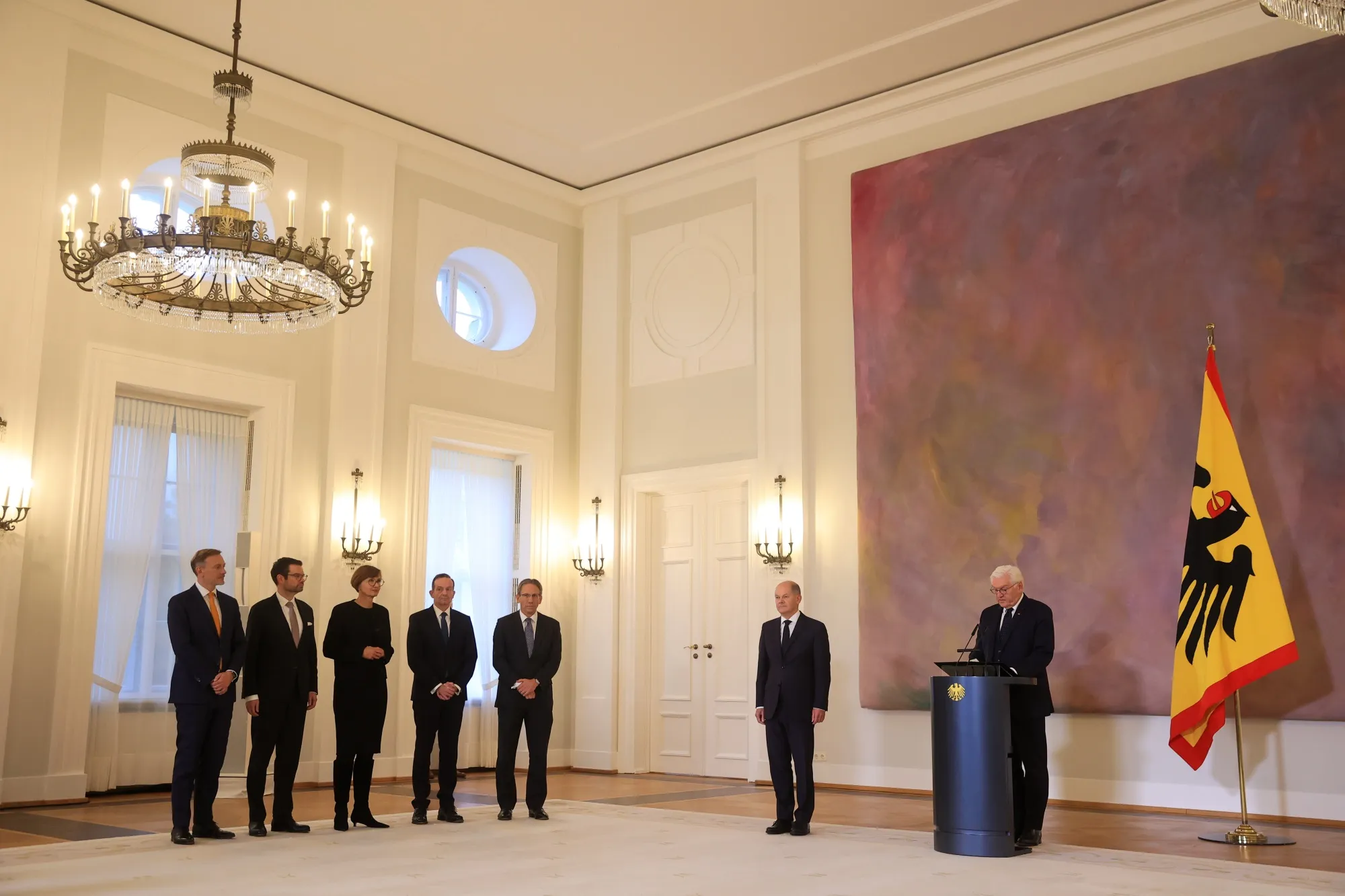 在施泰因迈尔的官邸举行的一场尴尬仪式上,林德纳、布施曼和即将离任的教育部长贝蒂娜·斯塔克-瓦岑格也在场,接受他们的解职信,施尔茨在一旁观看。