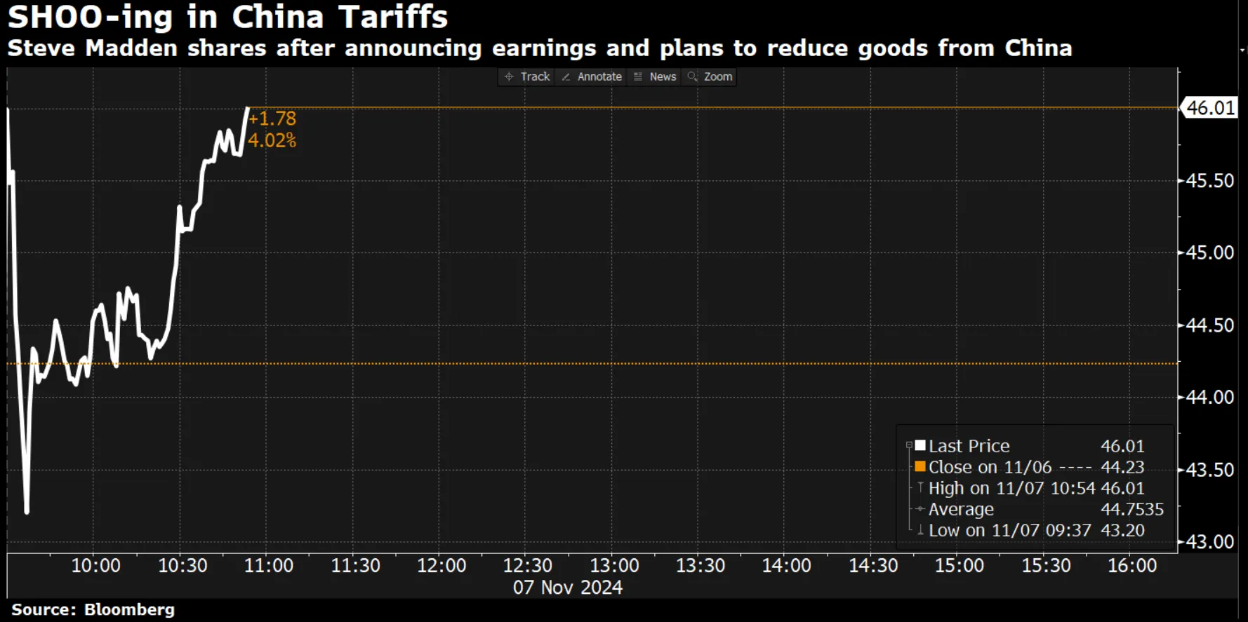 考虑到过去几年的事件,从中国的转变已经在进行中,这些事件当然包括疫情期间的供应链中断以及与中国的紧张关系和关税。(事实上,史蒂夫·马登已经在今年夏天表示,目标是每年减少10%从中国采购的商品)。但是,从每年10%到40-45%的转变似乎是个大事。那么,市场对史蒂夫·马登计划减少从中国采购的反应是什么呢?正如乔上面提到的,这里有一个重要的信号效应。如果投资者奖励那些迅速调整生产的公司,我们可能会看到美国与中国贸易的更快中断,甚至可能会看到特朗普政府实施更严厉的关税(因为这可能表明公司更能应对和/或迅速处理生产转移这一物流复杂的过程)。