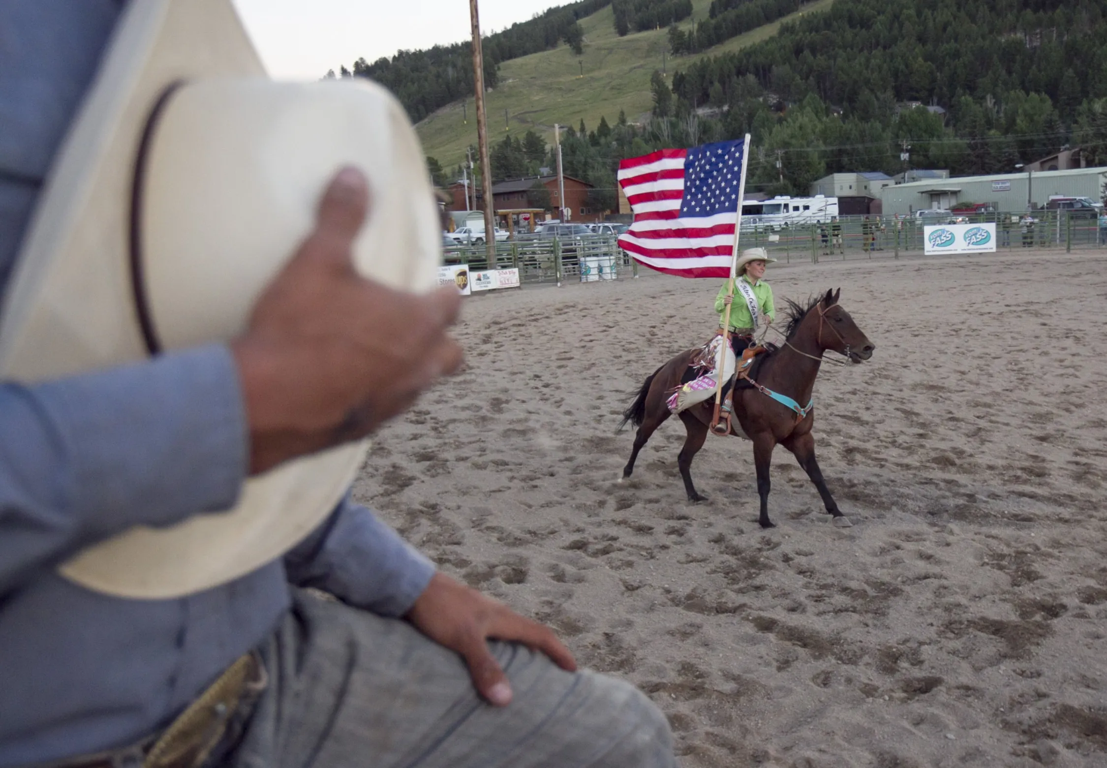 一位女牛仔在美国怀俄明州杰克逊霍尔的牛仔竞技表演中,国歌奏响时骑着马挥舞着美国国旗。
