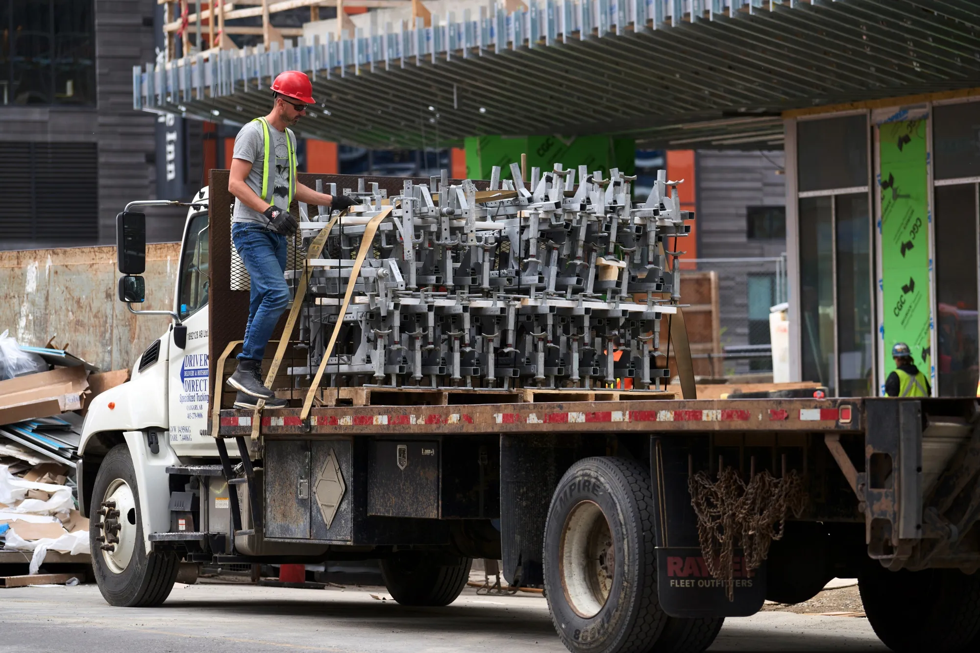 一名建筑工人在卡尔加里市中心卸货。