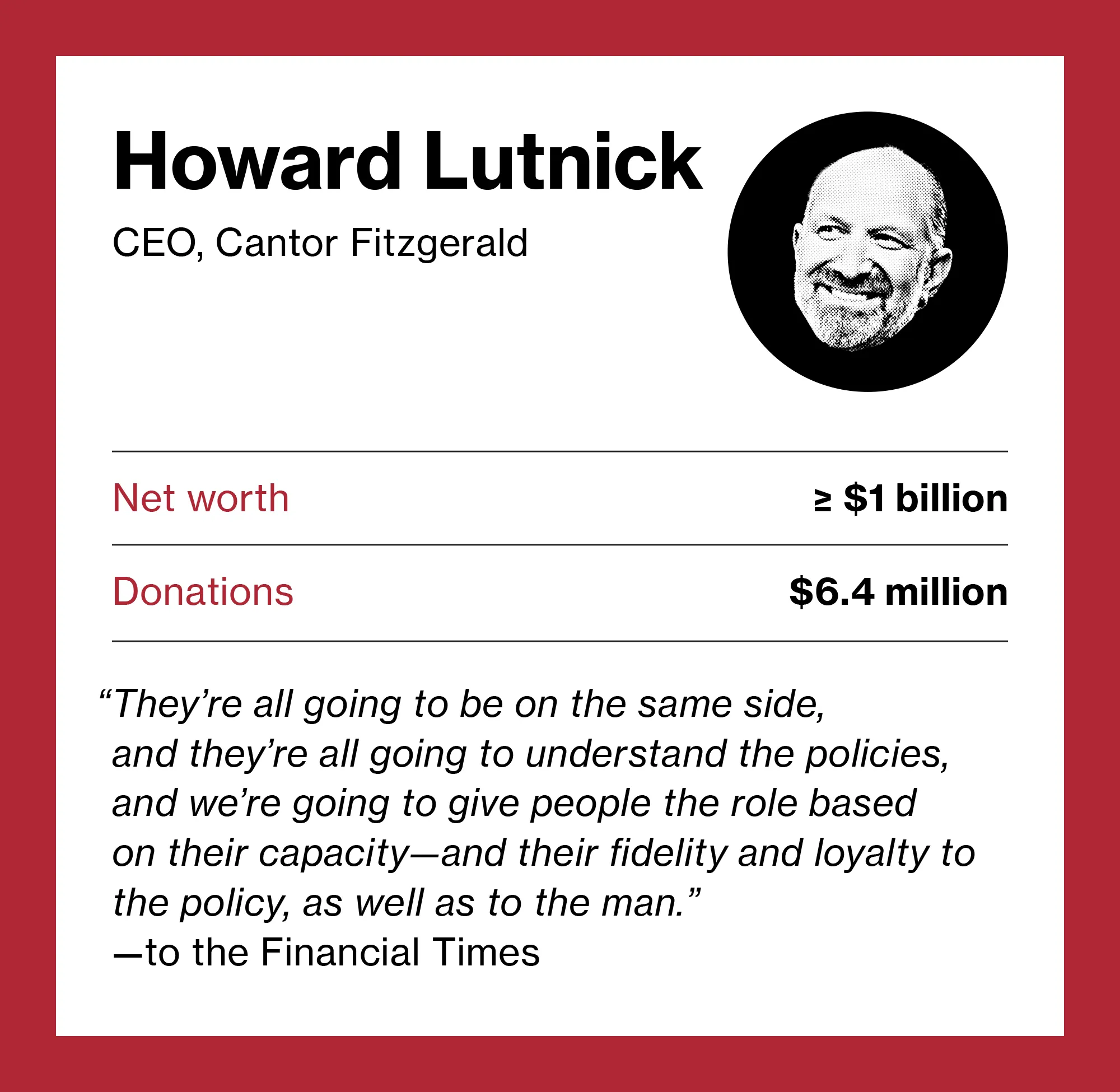 作为 当选总统过渡团队的联合主席,亿万富翁坎托尔·菲茨杰拉德的首席执行官正在制定政府各部门的职位候选人名单,并要求候选人对特朗普表现出极高的忠诚度。根据一位华尔街高管的说法,卢特尼是特朗普胜利后许多有权势商界人士的首批电话之一。