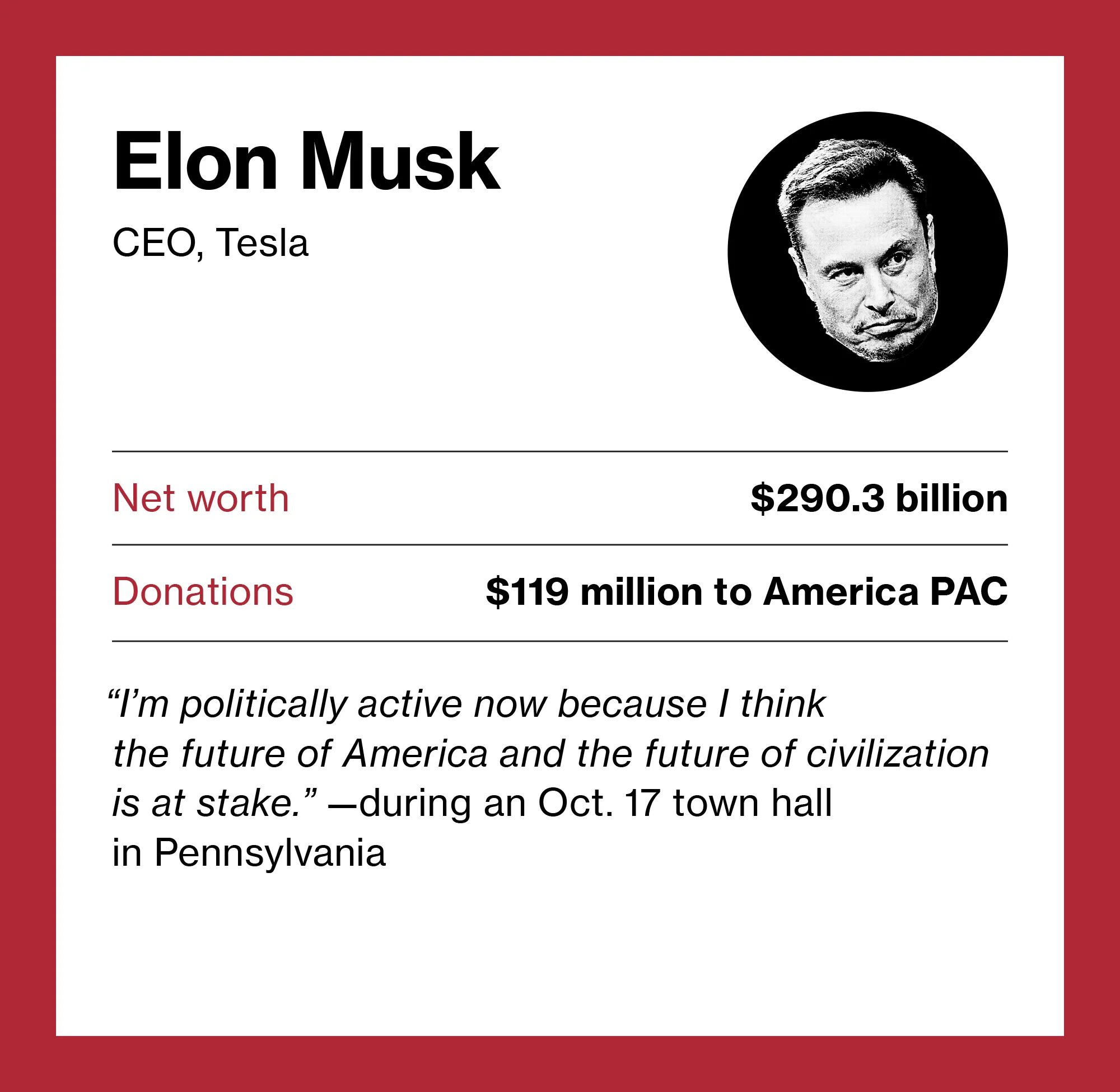 为了潜在的好处,特朗普的亿万富翁支持者为他的竞选活动提供了重大支持,而在整个竞选过程中,他的筹款一直落后于民主党候选人卡马拉·哈里斯。支持特朗普的超级政治行动委员会从三位个人——马斯克、拉斯维加斯金沙集团的主要股东米里亚姆·阿德尔森和银行继承人蒂莫西·梅隆——那里筹集了比他的竞选活动和共和党从他曾经强大的 小额捐赠者军队获得的更多资金。这与他之前的竞选活动相比发生了巨大变化,当时这些小额捐赠者给他的捐款是那些向超级政治行动委员会捐赠100万美元或更多的人的三倍。