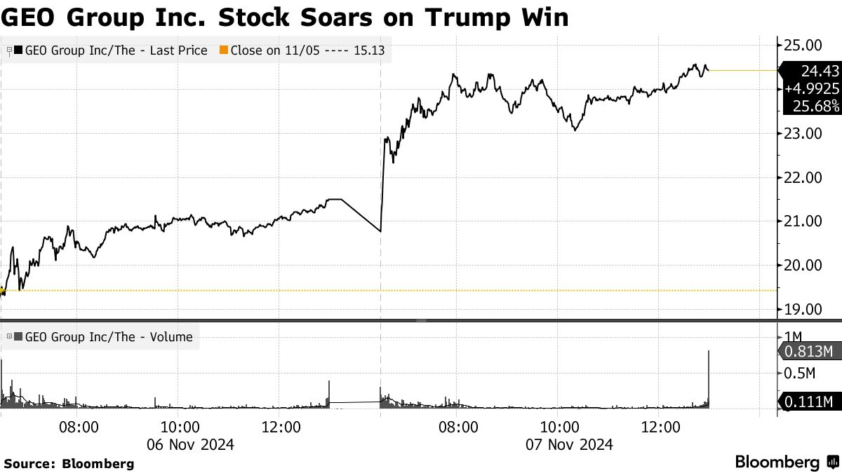 GEO Group的股票在周四飙升至每股24.43美元,而在选举前一天的收盘价为每股14.18美元。