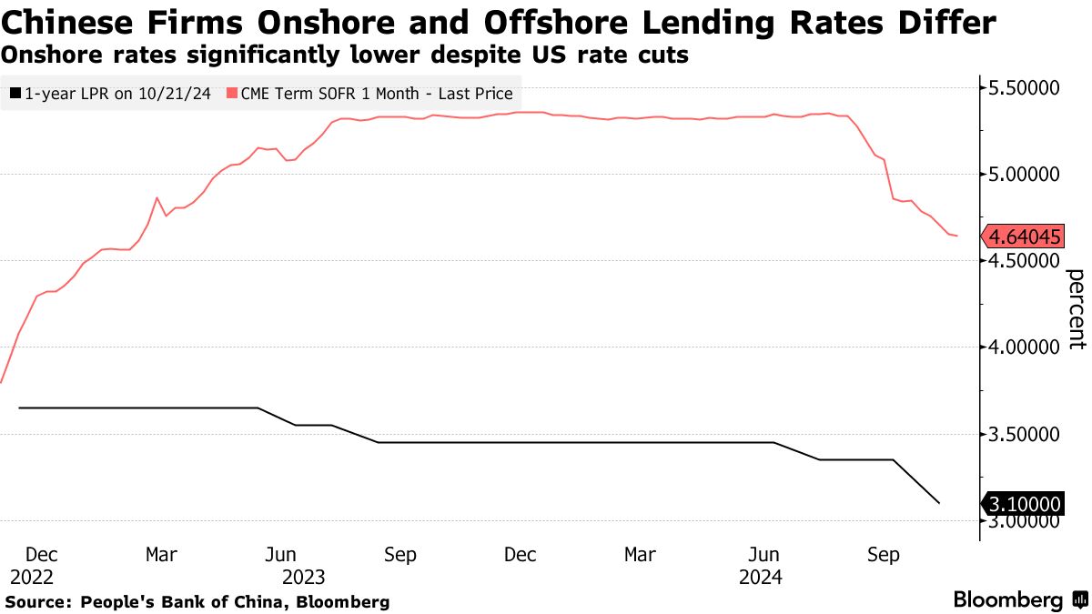在十月,中国贷款机构已 降低 贷款基础利率至3.10%,从3.35%下降,此前中国人民银行 大幅削减 其政策利率,这是九月底以来的最大降幅,旨在振兴其疲软的经济。相反,无风险的担保隔夜融资利率,作为美元交易的参考,徘徊在约4.86%,这是在美联储减息半个百分点之后的情况。