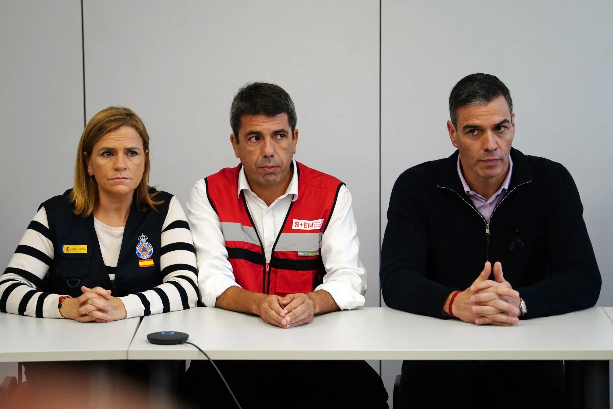 佩德罗·桑切斯(右)和卡洛斯·马宗(中)在10月31日的政府危机委员会会议上。摄影师:Manaure Quintero/法新社/盖蒂图片社第二天,在Mazon再次请求后,Sanchez宣布将向瓦伦西亚派遣5000名士兵。加上已经在场的部队,这代表了西班牙历史上最大的和平时期部署。