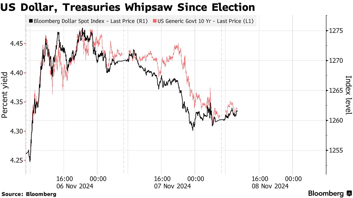 到周四收盘时,美元已经逆转了大部分选举后的激增,并且在周五的交易中变化不大。经过两天的剧烈波动,国债收益率也回到了近期的区间。中国股票和人民币,之前因对更高关税的担忧而 遭受重创,此后已逐渐回升。