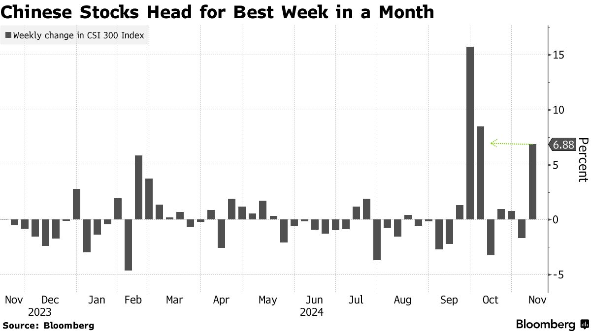 在特朗普上台初期的下跌之后,中国的CSI 300指数正朝着一个多月以来的最佳周表现迈进。尽管市场预期北京将推出更大规模的刺激措施以应对更高的关税,但周五晚些时候全国人民代表大会常务委员会会议的失望结果可能会重新加大抛售压力。