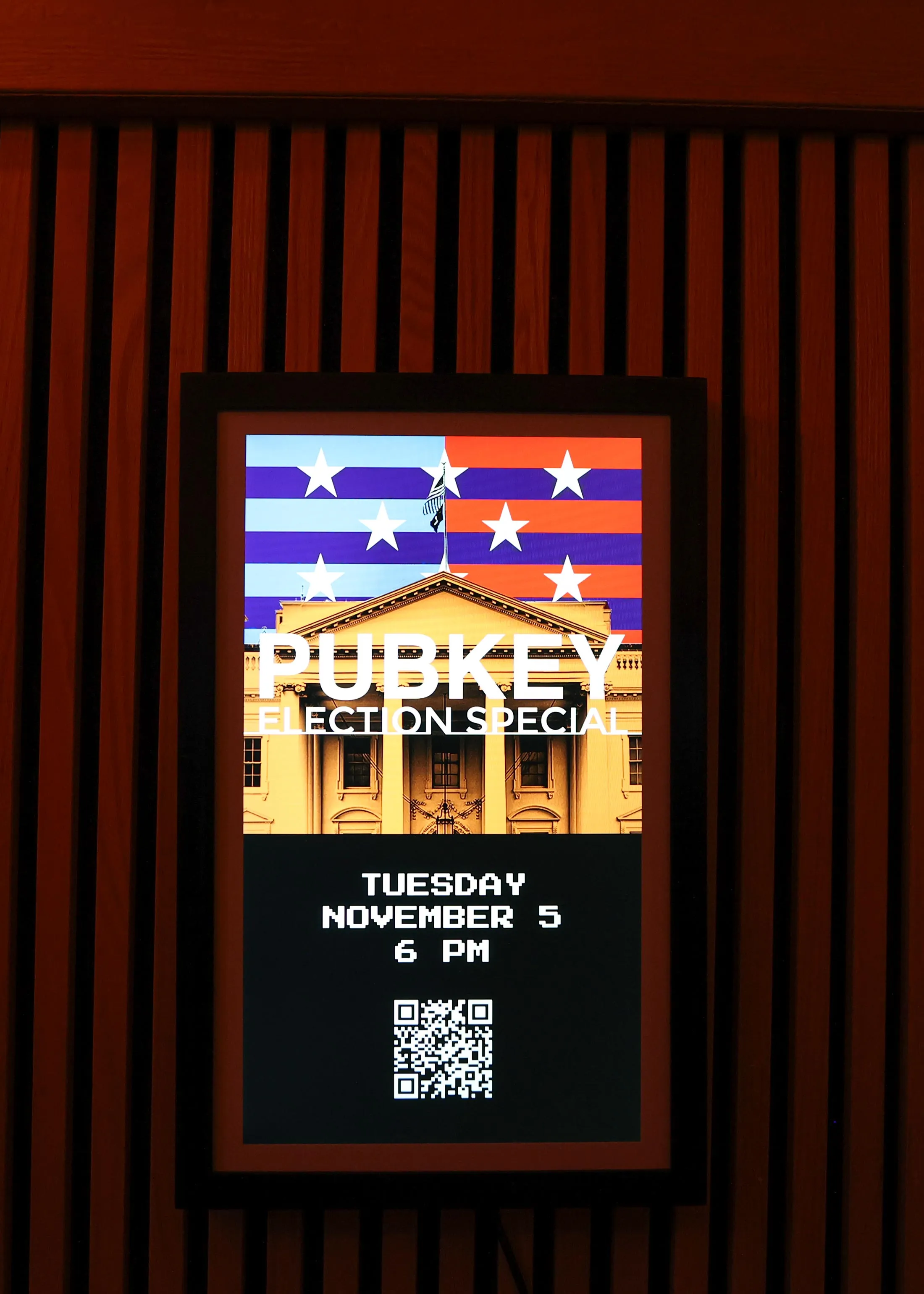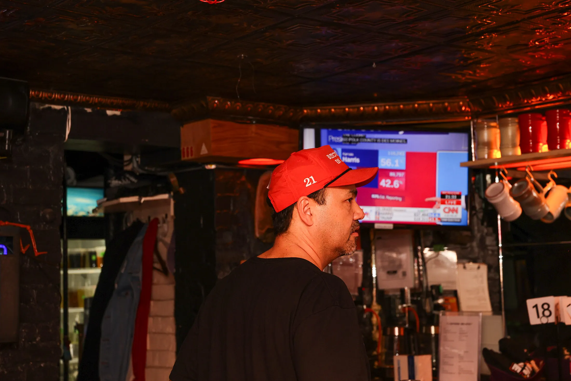 在后面的房间里,顾客们聚集在一起观看由 比特币杂志 主持的结果直播。其他人则在 Polymarket 上查看赔率。酒吧的老板告诉我,PubKey 不是特朗普酒吧,但几乎在场的每个人都说他们投票支持他。特朗普本人在九月份曾到访这个地下酒吧,并 用比特币支付了一堆汉堡,尽管他不得不把他正在使用的手机交给酒吧员工以完成交易。