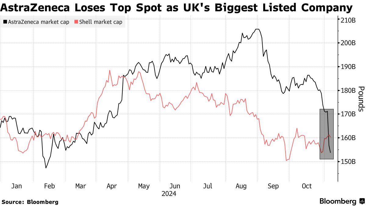 阿斯利康公司 本周的市场估值约为1710亿英镑(2220亿美元)。到周四收盘时,其市值已跌至略高于1500亿英镑,制药公司已失去作为英国市值最大的公司的地位,转而被壳牌公司取代。