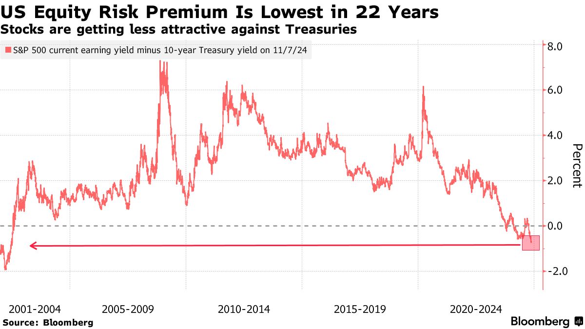 美国股票风险溢价,即投资股市所提供的超出无风险利率的额外回报,已降至22年来的最低水平,并且正在进入负值区域,这意味着股票客观上已经比债券更不具吸引力。
